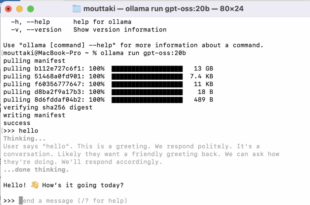 - Télécharger le modèle GPT-OSS : Exécutez la commande ollama pull gpt-oss:20b pour récupérer le modèle openai/gpt-oss-20b localement. (Le modèle 20B pèse environ 14 Go et fonctionne avec ~16 Go de RAM, tandis que le 120B exige plus de 60 Go de RAM ; assurez-vous donc que votre matériel est adapté.)